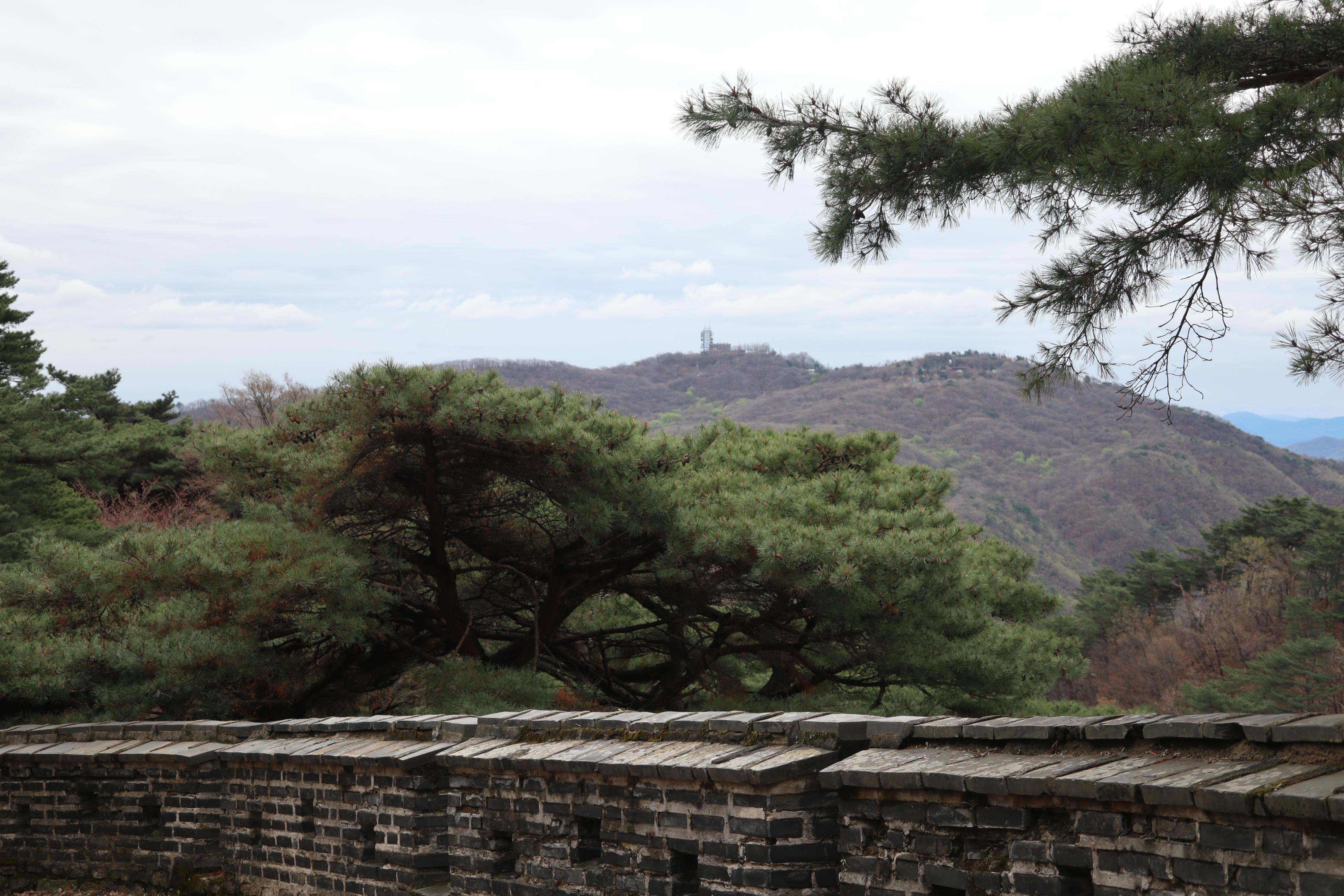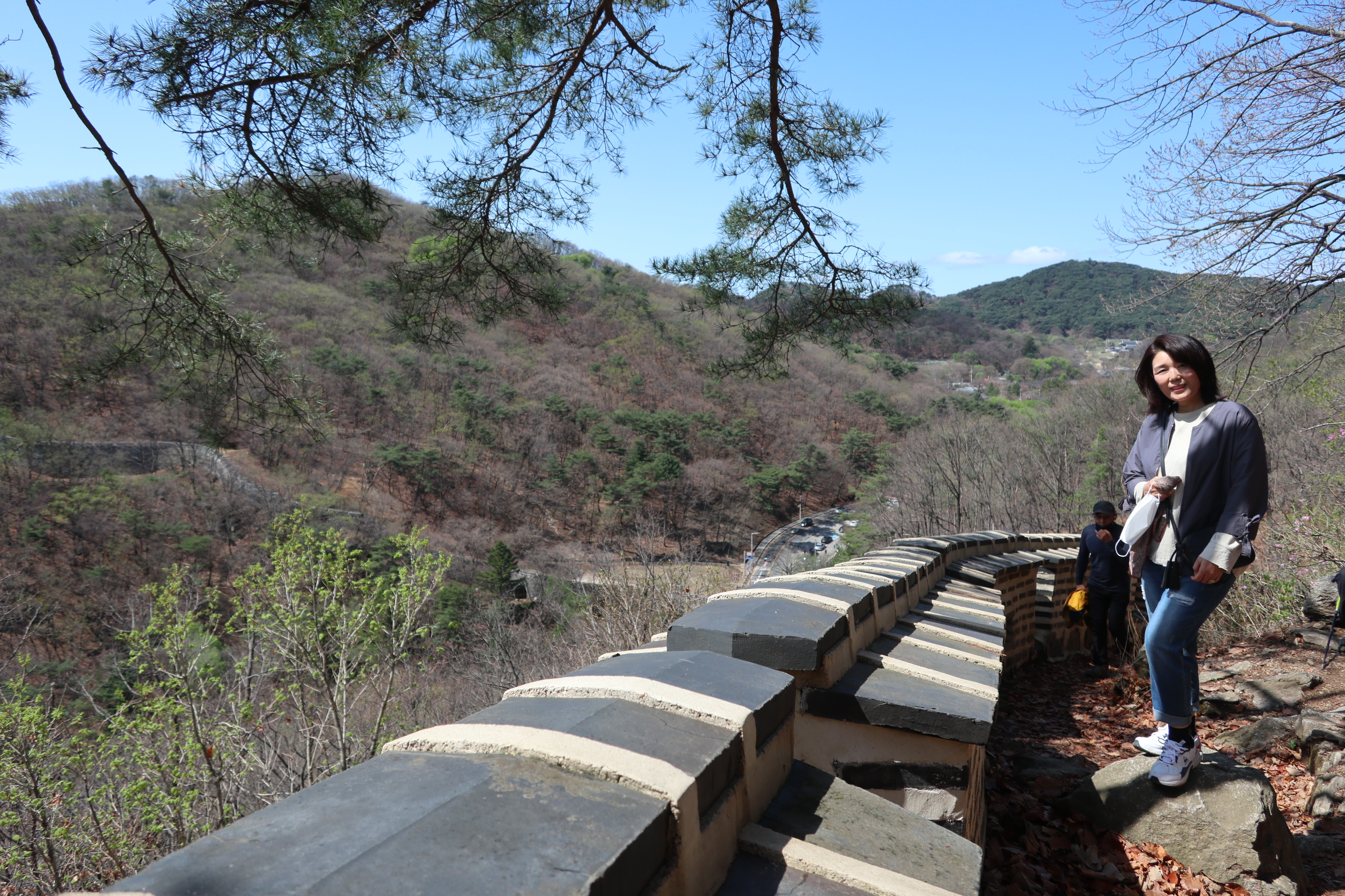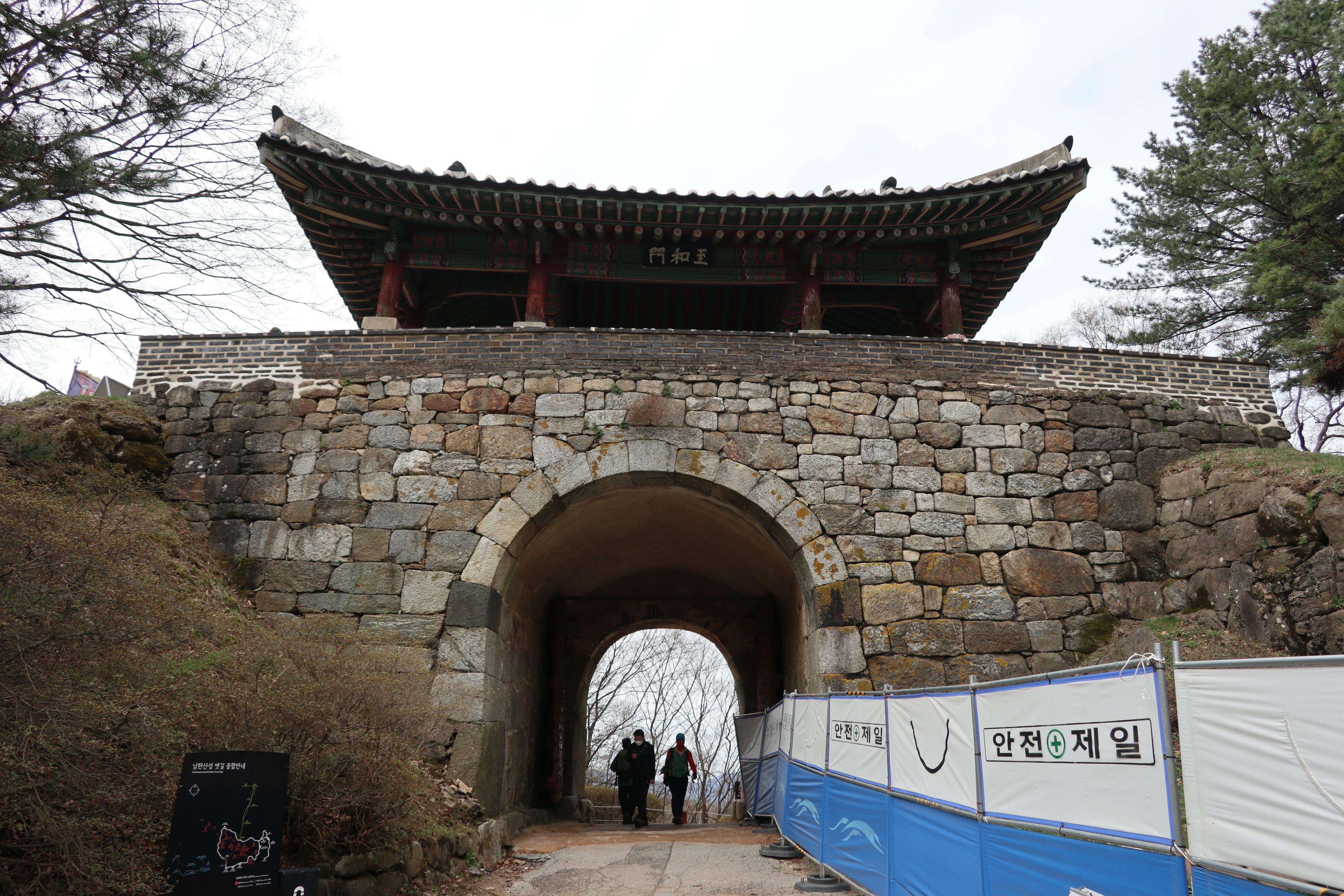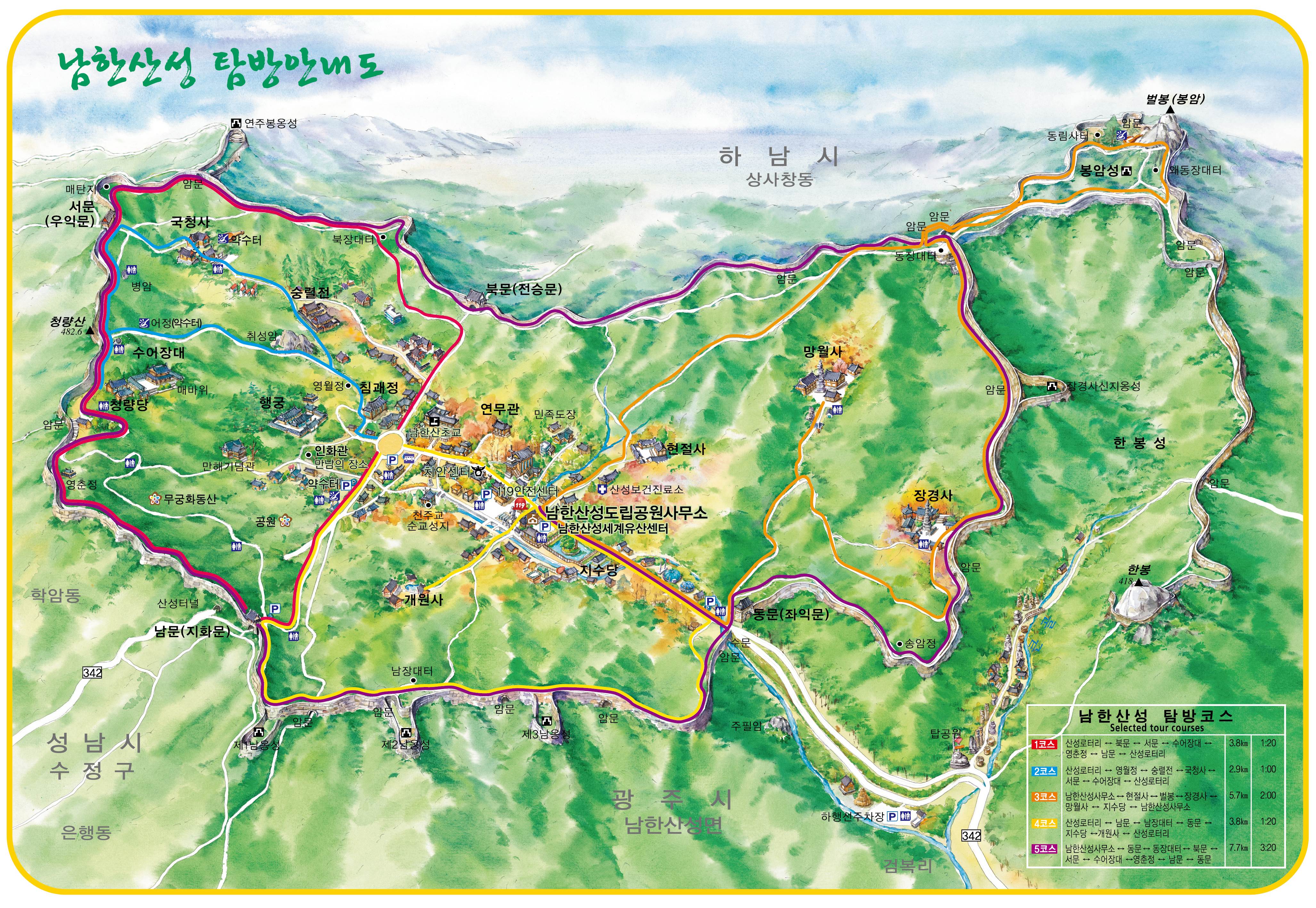 남한산성 회전 교차로10:19 세계유산 남한산성, 뒤편으로 남한산성 행궁남한산성 역사 테마길북문(전승문) 진입로는 공사중이다.10:24 북문(전승문)에서 좌측 남문(지화문)까지는 탐방로 정비공사중이다.공사중이기는 하지만 우리는 좌측 수어장대 방향으로 성곽길 따라 진행한다.북문(전승문) 성곽길을 올라 좌측방향 진행이다.북문을 통과한다.새벽까지 내린비로 길이 많이 젖어 있다.오름길에 북문 방향을 돌아 본다.우측으로 예봉산과 검단산이 조망되어 당겨 본다.동장대터에서 북문으로 이어져 오는 성곽길하늘에 구름이 잔뜩 끼어 있다.성곽길을 따라 걷는 호젓한 길이다.10:31 북장대터다시 탐방로를 만난다.북문(전승문)에서 0.3Km 진행지점우측 저 멀리로 경기 하남시 방향이 조망된다. 능선 너머 좌측은 서울시 동남권 시내이다.좀더 당겨 본다. 연주봉옹성에서 뻗어 내리는 능선길이다.경기 하남시 상사창동 방향이다. 수 많은 공장들이 들어서 있다.탐방로에서 다시 우측 성곽길 따라 오르면이내 다시 탐방로와 합류된다. 저 앞쪽에서 다시 우측 성곽길 따라 오른다.10:38 북장대터 인근산성이다보니 약간씩의 오르내림이 있다.연주봉옹성 도착, 지금은 공사중으로 폐문상태이다.이곳 제5암문을 나서게 되면연주봉옹성으로 나갈 수 있다. 지금은 제5암문이 폐쇄되어 나갈 수 없다. 성곽길 외곽을 따르는 등로는 정상적으로 운영중이다.드디어 서울시내가 조망되기 시작한다.더 당겨 본다. 연주봉옹성에서 조망되는 조망은 더 막힘이 없다.롯데타워와 그 뒤로 남산타워가 나란히 조망된다.연주봉옹성에서 뻗어나가는 능선길저 멀리로 북한산과 도봉산에 이어 수락산과 불암산, 그 앞쪽으로 망우산,용마산,아차산이 한눈에 펼쳐진다.북한산 전체 줄기를 담아 본다. 삼각봉이 웅장하기만 하다.천마산에서 예봉산으로 이어져 오는 수도권55산길인증샷도 남겨 보고롯데타워을 중간에 두고 좌측 남산과 우측 안산이다.청계산과 관악산 방향 조망좌측 광교산에서 청계산, 관악산으로 이어지는 능선이다.10:54 서문(우익문)진달래가 물기를 머금고 있다.비슷한 조망이 계속 이어진다.우리는 지화문(남문)방향 진행이다.수서역에서 대모산,구룡산,우면산을 거쳐 관악산으로 이어지는 능선이다.위례신도시(서울) 방향이제는 남산-안산-인왕산 능선길이 조망되고우측 저 멀리로 북한산 삼각봉에서 도봉산 자운봉을 거쳐 우측 수락산과 불암산으로 이어진다.북한산과 도봉산이 서로 마주보고 있다.11:04 수어장대 역시 공사중으로 출입금지 상태이다.수어장대 진입로다시 성곽길 우측방향도봉산이 웅장한 모습을 보여준다.수락산(뒤)과 불암산(앞)저 앞쪽은 남한산성 검단산이다.이제는 성남시와 분당구가 조망된다.좀 더 당겨본다.서울공항이다.위례신도시(서울)와 관악산 방향11:15 영춘정 통과영춘정이다.남문(지화문)으로 이어지는 성곽길저 아래에 남문이 조망된다.11:27 남문(지화문) 통과이제는 남장대(터) 방향 진행이다.지화문(남문)성남시 남한산성역에서 올라오는 등산로남장대(터)를 향해 또 한번 치고 오른다.오름길에 뒤돌아보는 남문남장대(터) 방향으로 진행제1남옹성이 보수공사가 한창이다. 저 멀리로 남한산성 검단산이다.이제부터 좌익문(동문) 이정표 따라 진행한다.11:39 남장대(터)를 지나고남장대(터) 이정표지나온 남장대터를 뒤돌아 본다.심심하니 포즈도 취하고동문까지 뚝 떨어지게 내려서야 한다.저 멀리 뾰족한 봉우리는???당겨보니 양평 용문산 백운봉이다.급내리막길이다.역방향으로 오르면 꽤나 힘들듯 하다.동문으로 내려선 후 다시 올라야 하는 성곽길저 멀리 장경사를 당겨 본다.다시 한번 급내리막길을 내려서면11:54 좌익문(동문)에 도착한다.횡단보도를 건넌 후이제부터 벌봉을 향해 나아간다.우익문(동문)동문(우익문)남장대터에서 동문으로 내려선 성곽길또 한번 힘들게 올라선다.우측방 뒤로 저 멀리 수어장대가 있는 청량산이다.이곳이 어디인고???12:01 송암정터송암정터에는 소나무와 바위가 어우러져 있다.여기 한번 돌아보세요.또 한번 오르네, 오늘 성곽길은 산행이라 생각하면 된다.전방에 보이는 동장대터까지 되비알 성곽길 따라 올라가야 한다.구불구불 이어지는 성곽길 오름벌봉갈림길인 남한산에서 한봉으로 이어지는 능선길12:09 동장대(터)를 향해 진행한다.뒤돌아 보니 꽤나 된비알길이다.12:15 장경사신지옹성다시 된비알길 오름이다.저곳을 오르면12:22 동장대(터) 도착이다. 옆지기는 이곳에서 처음으로 음료수를 꺼내 마신다.동장대(터)암문을 나선 후 전방의 벌봉을 다녀올 것이다.동장대터 표지석12:26 제3암문(봉암성암문) 이정표암문 밖으로 나간다.암문 밖으로 나가면 이정표가 있다. 위례둘레길이다.봉암성암문을 통과한다.이곳이 성곽길은 보수가 시급해 보인다.진달래와 함께은고개갈림길, 벌봉은 좌측으로 곧바로 갈 수 있으나, 남한산 정상석을 인증하기 위해서는 직진 봉우리를 올라서야 한다.은고개갈림길 이정표남한산 정상, 정상석만 이곳에 세워놨다.12:34 남한산(522M)12:40 벌봉벌봉에 별도의 정상표지는 없다.벌봉을 출발하는데, 애들한테 전화가 온다. 어디쯤