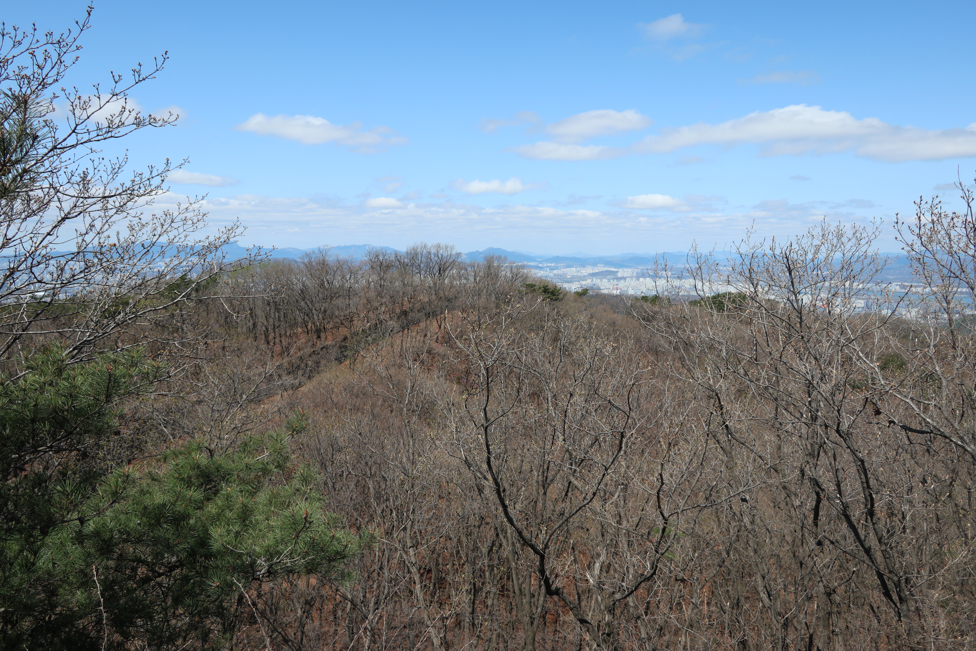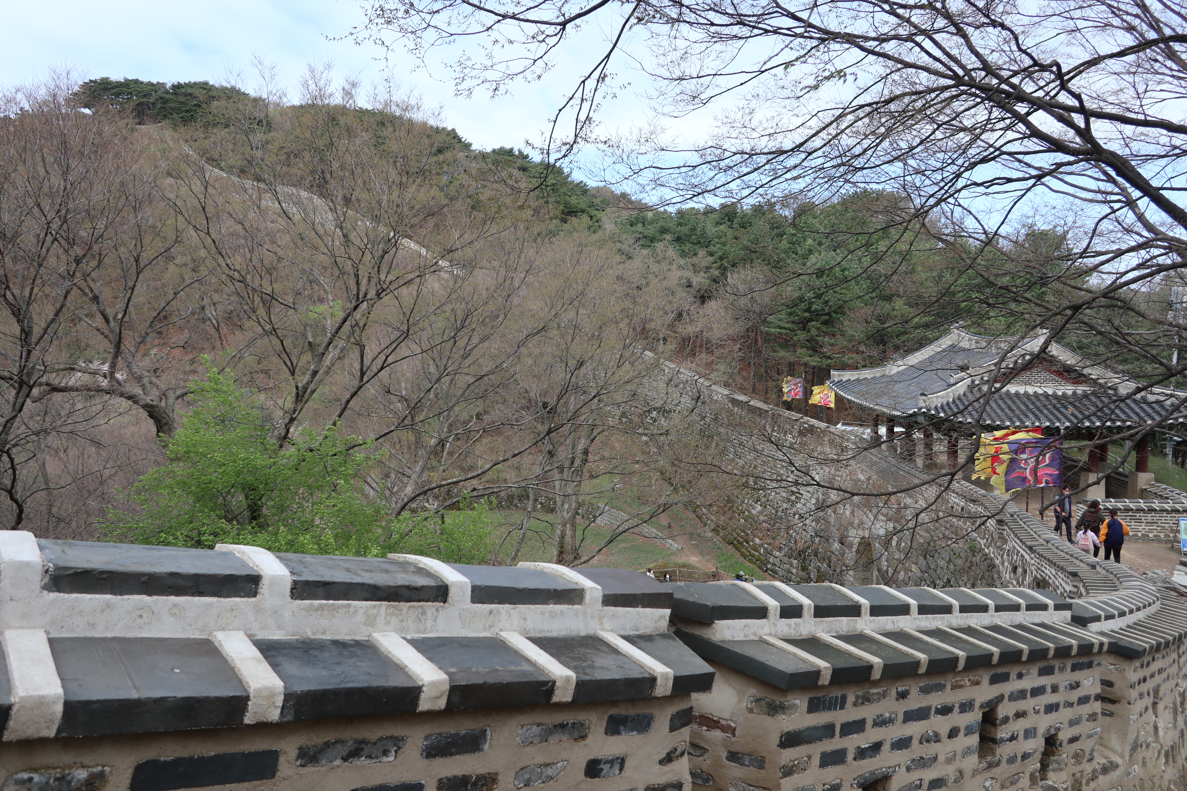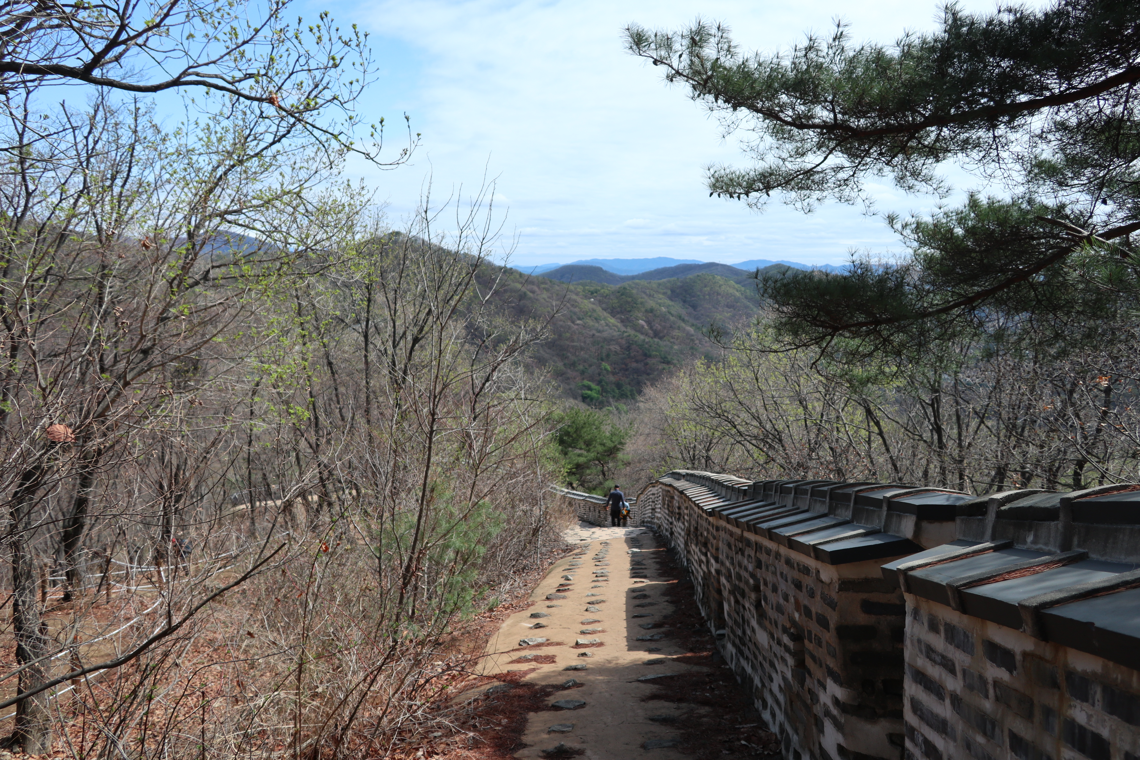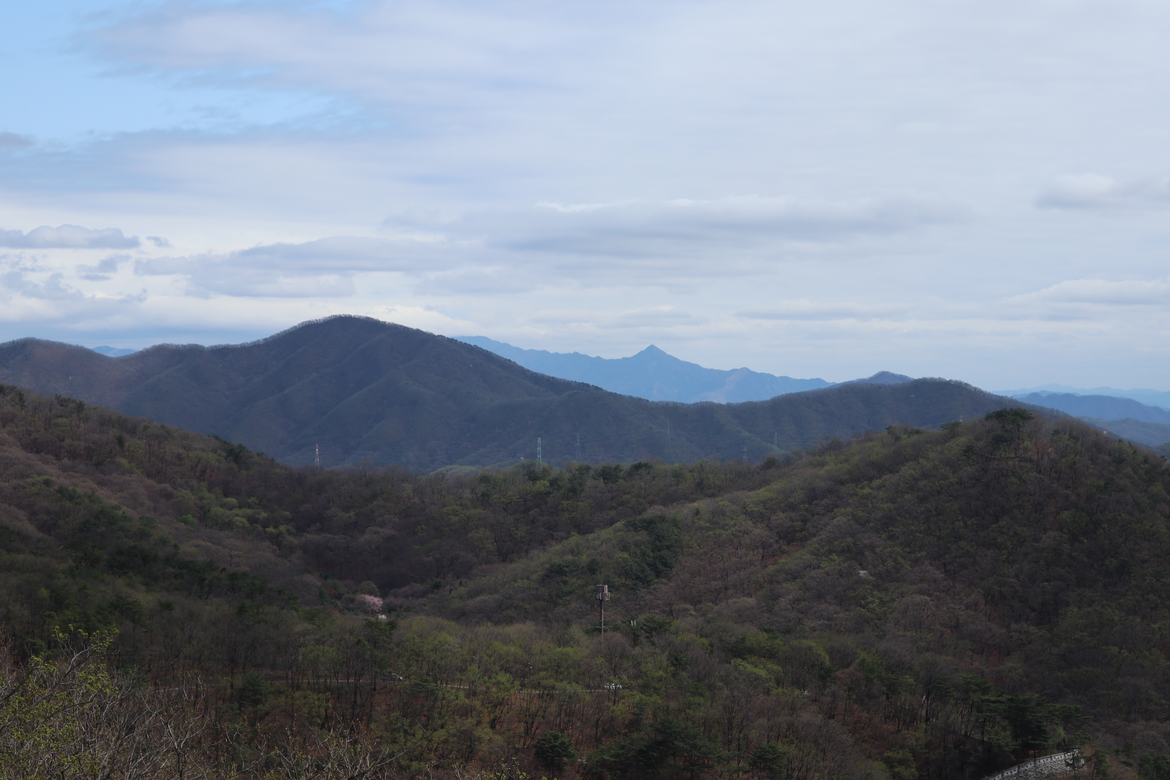 남한산성 회전 교차로10:19 세계유산 남한산성, 뒤편으로 남한산성 행궁남한산성 역사 테마길북문(전승문) 진입로는 공사중이다.10:24 북문(전승문)에서 좌측 남문(지화문)까지는 탐방로 정비공사중이다.공사중이기는 하지만 우리는 좌측 수어장대 방향으로 성곽길 따라 진행한다.북문(전승문) 성곽길을 올라 좌측방향 진행이다.북문을 통과한다.새벽까지 내린비로 길이 많이 젖어 있다.오름길에 북문 방향을 돌아 본다.우측으로 예봉산과 검단산이 조망되어 당겨 본다.동장대터에서 북문으로 이어져 오는 성곽길하늘에 구름이 잔뜩 끼어 있다.성곽길을 따라 걷는 호젓한 길이다.10:31 북장대터다시 탐방로를 만난다.북문(전승문)에서 0.3Km 진행지점우측 저 멀리로 경기 하남시 방향이 조망된다. 능선 너머 좌측은 서울시 동남권 시내이다.좀더 당겨 본다. 연주봉옹성에서 뻗어 내리는 능선길이다.경기 하남시 상사창동 방향이다. 수 많은 공장들이 들어서 있다.탐방로에서 다시 우측 성곽길 따라 오르면이내 다시 탐방로와 합류된다. 저 앞쪽에서 다시 우측 성곽길 따라 오른다.10:38 북장대터 인근산성이다보니 약간씩의 오르내림이 있다.연주봉옹성 도착, 지금은 공사중으로 폐문상태이다.이곳 제5암문을 나서게 되면연주봉옹성으로 나갈 수 있다. 지금은 제5암문이 폐쇄되어 나갈 수 없다. 성곽길 외곽을 따르는 등로는 정상적으로 운영중이다.드디어 서울시내가 조망되기 시작한다.더 당겨 본다. 연주봉옹성에서 조망되는 조망은 더 막힘이 없다.롯데타워와 그 뒤로 남산타워가 나란히 조망된다.연주봉옹성에서 뻗어나가는 능선길저 멀리로 북한산과 도봉산에 이어 수락산과 불암산, 그 앞쪽으로 망우산,용마산,아차산이 한눈에 펼쳐진다.북한산 전체 줄기를 담아 본다. 삼각봉이 웅장하기만 하다.천마산에서 예봉산으로 이어져 오는 수도권55산길인증샷도 남겨 보고롯데타워을 중간에 두고 좌측 남산과 우측 안산이다.청계산과 관악산 방향 조망좌측 광교산에서 청계산, 관악산으로 이어지는 능선이다.10:54 서문(우익문)진달래가 물기를 머금고 있다.비슷한 조망이 계속 이어진다.우리는 지화문(남문)방향 진행이다.수서역에서 대모산,구룡산,우면산을 거쳐 관악산으로 이어지는 능선이다.위례신도시(서울) 방향이제는 남산-안산-인왕산 능선길이 조망되고우측 저 멀리로 북한산 삼각봉에서 도봉산 자운봉을 거쳐 우측 수락산과 불암산으로 이어진다.북한산과 도봉산이 서로 마주보고 있다.11:04 수어장대 역시 공사중으로 출입금지 상태이다.수어장대 진입로다시 성곽길 우측방향도봉산이 웅장한 모습을 보여준다.수락산(뒤)과 불암산(앞)저 앞쪽은 남한산성 검단산이다.이제는 성남시와 분당구가 조망된다.좀 더 당겨본다.서울공항이다.위례신도시(서울)와 관악산 방향11:15 영춘정 통과영춘정이다.남문(지화문)으로 이어지는 성곽길저 아래에 남문이 조망된다.11:27 남문(지화문) 통과이제는 남장대(터) 방향 진행이다.지화문(남문)성남시 남한산성역에서 올라오는 등산로남장대(터)를 향해 또 한번 치고 오른다.오름길에 뒤돌아보는 남문남장대(터) 방향으로 진행제1남옹성이 보수공사가 한창이다. 저 멀리로 남한산성 검단산이다.이제부터 좌익문(동문) 이정표 따라 진행한다.11:39 남장대(터)를 지나고남장대(터) 이정표지나온 남장대터를 뒤돌아 본다.심심하니 포즈도 취하고동문까지 뚝 떨어지게 내려서야 한다.저 멀리 뾰족한 봉우리는???당겨보니 양평 용문산 백운봉이다.급내리막길이다.역방향으로 오르면 꽤나 힘들듯 하다.동문으로 내려선 후 다시 올라야 하는 성곽길저 멀리 장경사를 당겨 본다.다시 한번 급내리막길을 내려서면11:54 좌익문(동문)에 도착한다.횡단보도를 건넌 후이제부터 벌봉을 향해 나아간다.우익문(동문)동문(우익문)남장대터에서 동문으로 내려선 성곽길또 한번 힘들게 올라선다.우측방 뒤로 저 멀리 수어장대가 있는 청량산이다.이곳이 어디인고???12:01 송암정터송암정터에는 소나무와 바위가 어우러져 있다.여기 한번 돌아보세요.또 한번 오르네, 오늘 성곽길은 산행이라 생각하면 된다.전방에 보이는 동장대터까지 되비알 성곽길 따라 올라가야 한다.구불구불 이어지는 성곽길 오름벌봉갈림길인 남한산에서 한봉으로 이어지는 능선길12:09 동장대(터)를 향해 진행한다.뒤돌아 보니 꽤나 된비알길이다.12:15 장경사신지옹성다시 된비알길 오름이다.저곳을 오르면12:22 동장대(터) 도착이다. 옆지기는 이곳에서 처음으로 음료수를 꺼내 마신다.동장대(터)암문을 나선 후 전방의 벌봉을 다녀올 것이다.동장대터 표지석12:26 제3암문(봉암성암문) 이정표암문 밖으로 나간다.암문 밖으로 나가면 이정표가 있다. 위례둘레길이다.봉암성암문을 통과한다.이곳이 성곽길은 보수가 시급해 보인다.진달래와 함께은고개갈림길, 벌봉은 좌측으로 곧바로 갈 수 있으나, 남한산 정상석을 인증하기 위해서는 직진 봉우리를 올라서야 한다.은고개갈림길 이정표남한산 정상, 정상석만 이곳에 세워놨다.12:34 남한산(522M)12:40 벌봉벌봉에 별도의 정상표지는 없다.벌봉을 출발하는데, 애들한테 전화가 온다. 어디쯤