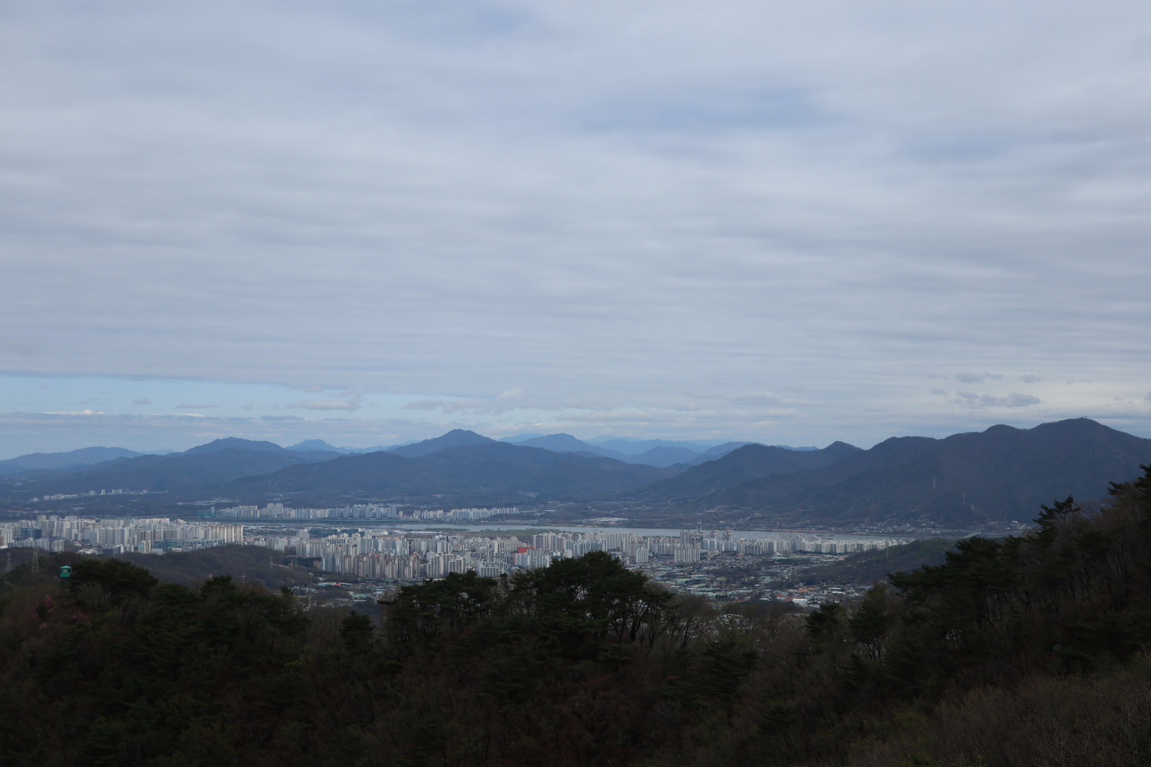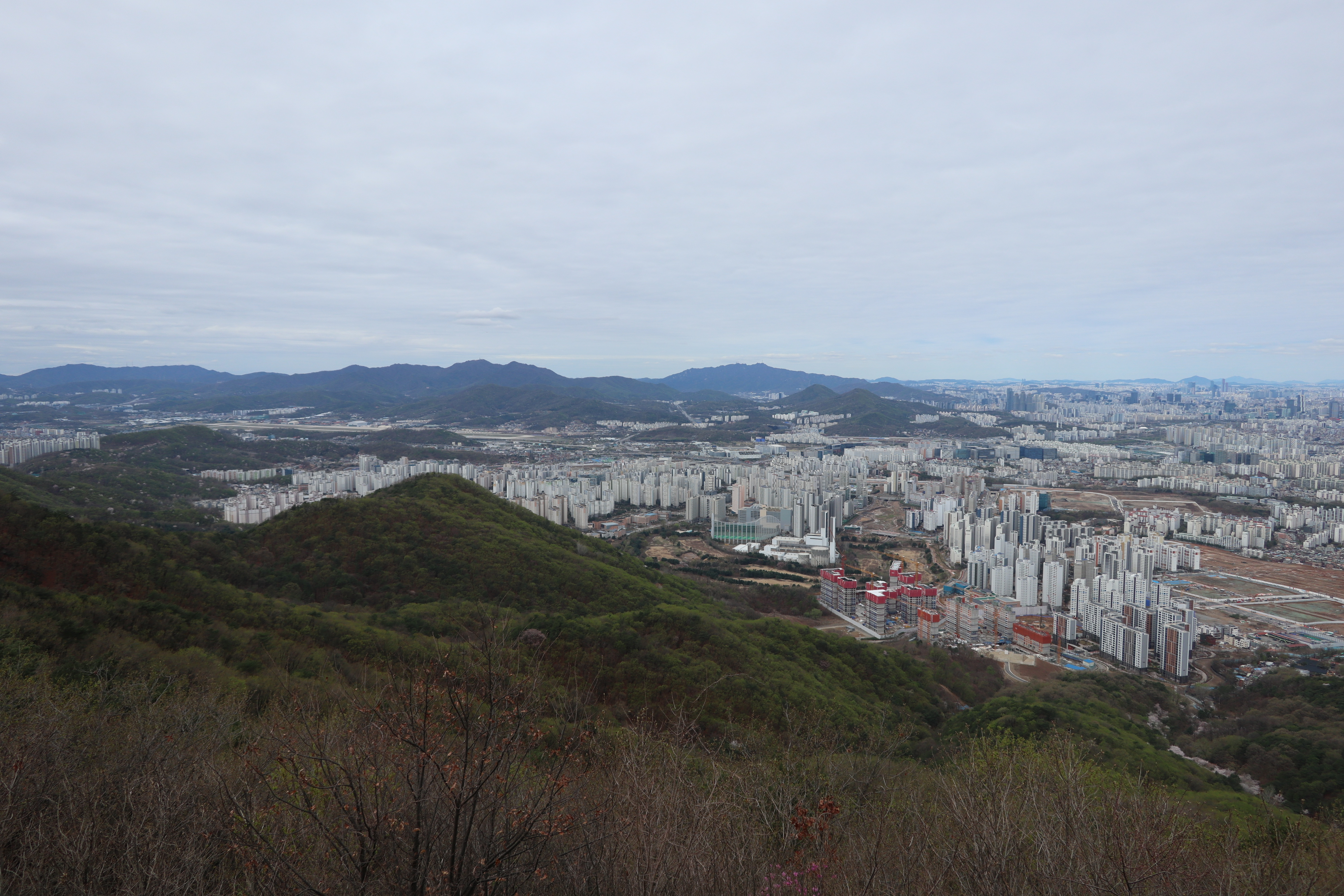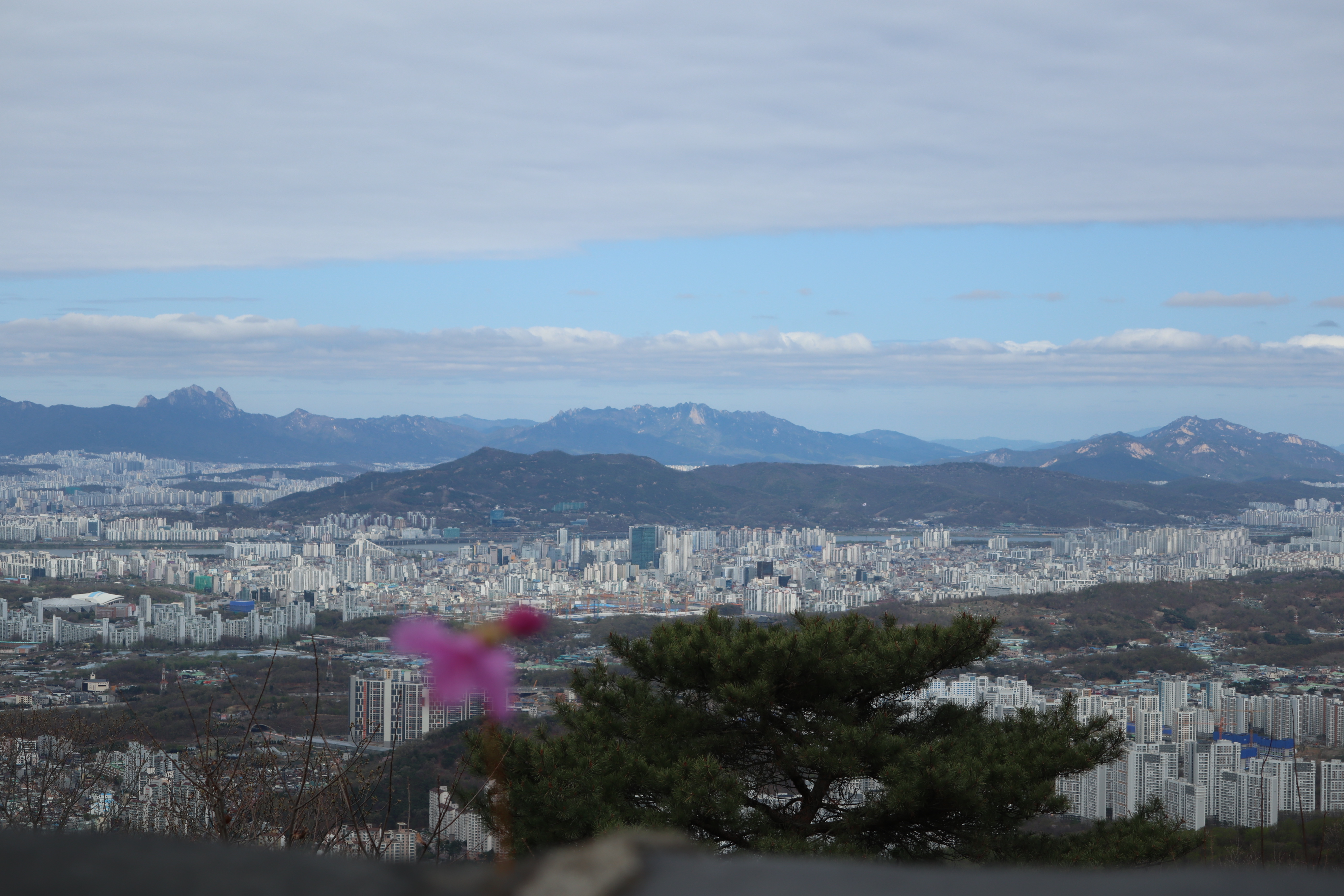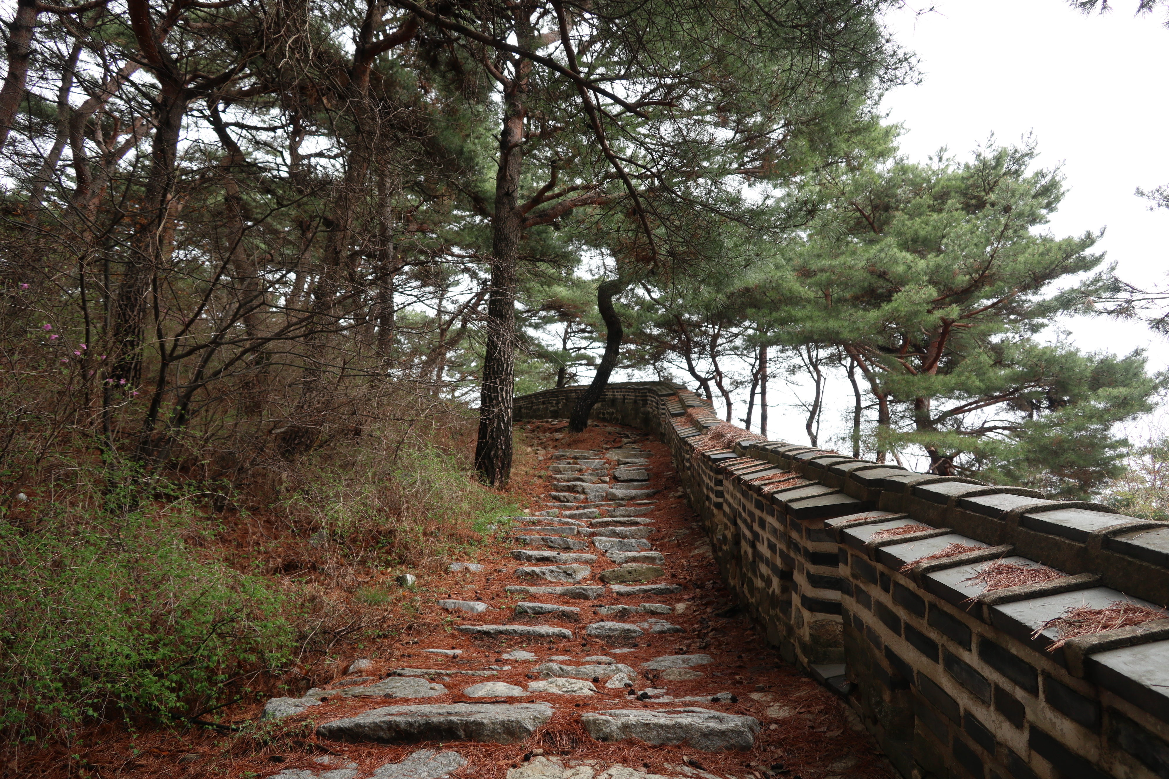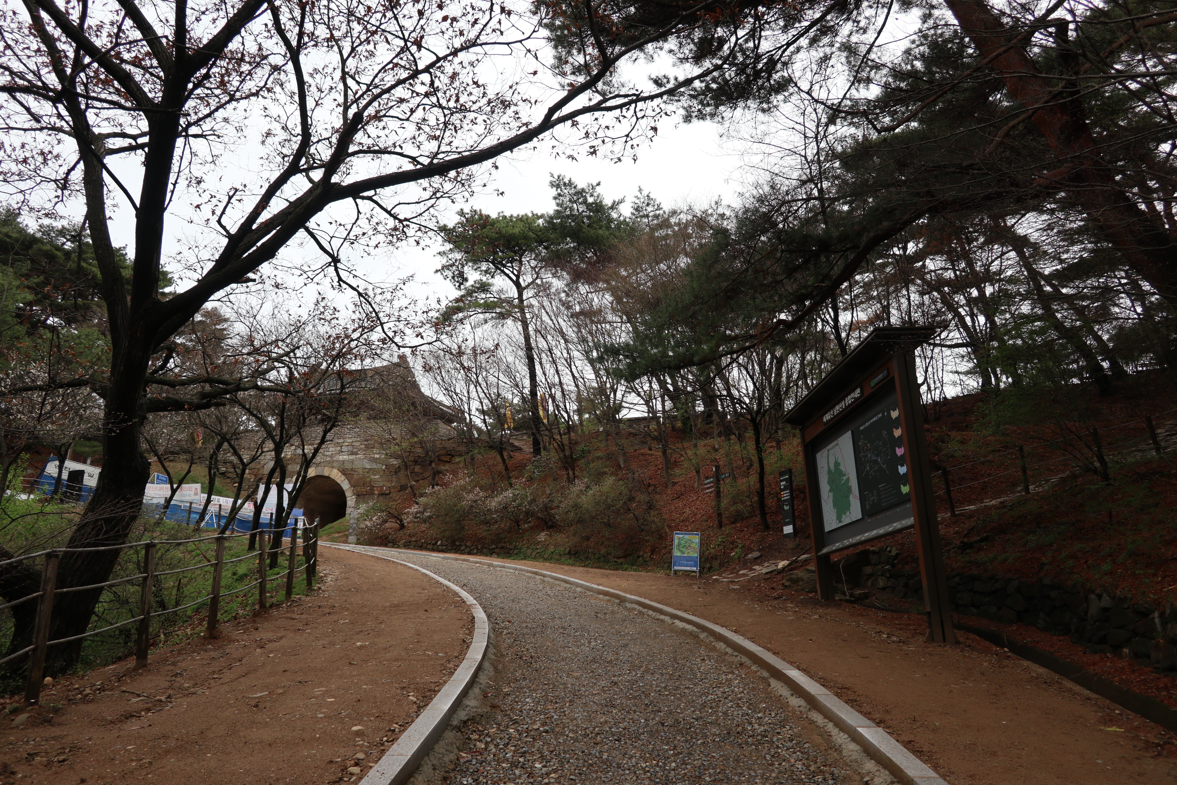남한산성 회전 교차로10:19 세계유산 남한산성, 뒤편으로 남한산성 행궁남한산성 역사 테마길북문(전승문) 진입로는 공사중이다.10:24 북문(전승문)에서 좌측 남문(지화문)까지는 탐방로 정비공사중이다.공사중이기는 하지만 우리는 좌측 수어장대 방향으로 성곽길 따라 진행한다.북문(전승문) 성곽길을 올라 좌측방향 진행이다.북문을 통과한다.새벽까지 내린비로 길이 많이 젖어 있다.오름길에 북문 방향을 돌아 본다.우측으로 예봉산과 검단산이 조망되어 당겨 본다.동장대터에서 북문으로 이어져 오는 성곽길하늘에 구름이 잔뜩 끼어 있다.성곽길을 따라 걷는 호젓한 길이다.10:31 북장대터다시 탐방로를 만난다.북문(전승문)에서 0.3Km 진행지점우측 저 멀리로 경기 하남시 방향이 조망된다. 능선 너머 좌측은 서울시 동남권 시내이다.좀더 당겨 본다. 연주봉옹성에서 뻗어 내리는 능선길이다.경기 하남시 상사창동 방향이다. 수 많은 공장들이 들어서 있다.탐방로에서 다시 우측 성곽길 따라 오르면이내 다시 탐방로와 합류된다. 저 앞쪽에서 다시 우측 성곽길 따라 오른다.10:38 북장대터 인근산성이다보니 약간씩의 오르내림이 있다.연주봉옹성 도착, 지금은 공사중으로 폐문상태이다.이곳 제5암문을 나서게 되면연주봉옹성으로 나갈 수 있다. 지금은 제5암문이 폐쇄되어 나갈 수 없다. 성곽길 외곽을 따르는 등로는 정상적으로 운영중이다.드디어 서울시내가 조망되기 시작한다.더 당겨 본다. 연주봉옹성에서 조망되는 조망은 더 막힘이 없다.롯데타워와 그 뒤로 남산타워가 나란히 조망된다.연주봉옹성에서 뻗어나가는 능선길저 멀리로 북한산과 도봉산에 이어 수락산과 불암산, 그 앞쪽으로 망우산,용마산,아차산이 한눈에 펼쳐진다.북한산 전체 줄기를 담아 본다. 삼각봉이 웅장하기만 하다.천마산에서 예봉산으로 이어져 오는 수도권55산길인증샷도 남겨 보고롯데타워을 중간에 두고 좌측 남산과 우측 안산이다.청계산과 관악산 방향 조망좌측 광교산에서 청계산, 관악산으로 이어지는 능선이다.10:54 서문(우익문)진달래가 물기를 머금고 있다.비슷한 조망이 계속 이어진다.우리는 지화문(남문)방향 진행이다.수서역에서 대모산,구룡산,우면산을 거쳐 관악산으로 이어지는 능선이다.위례신도시(서울) 방향이제는 남산-안산-인왕산 능선길이 조망되고우측 저 멀리로 북한산 삼각봉에서 도봉산 자운봉을 거쳐 우측 수락산과 불암산으로 이어진다.북한산과 도봉산이 서로 마주보고 있다.11:04 수어장대 역시 공사중으로 출입금지 상태이다.수어장대 진입로다시 성곽길 우측방향도봉산이 웅장한 모습을 보여준다.수락산(뒤)과 불암산(앞)저 앞쪽은 남한산성 검단산이다.이제는 성남시와 분당구가 조망된다.좀 더 당겨본다.서울공항이다.위례신도시(서울)와 관악산 방향11:15 영춘정 통과영춘정이다.남문(지화문)으로 이어지는 성곽길저 아래에 남문이 조망된다.11:27 남문(지화문) 통과이제는 남장대(터) 방향 진행이다.지화문(남문)성남시 남한산성역에서 올라오는 등산로남장대(터)를 향해 또 한번 치고 오른다.오름길에 뒤돌아보는 남문남장대(터) 방향으로 진행제1남옹성이 보수공사가 한창이다. 저 멀리로 남한산성 검단산이다.이제부터 좌익문(동문) 이정표 따라 진행한다.11:39 남장대(터)를 지나고남장대(터) 이정표지나온 남장대터를 뒤돌아 본다.심심하니 포즈도 취하고동문까지 뚝 떨어지게 내려서야 한다.저 멀리 뾰족한 봉우리는???당겨보니 양평 용문산 백운봉이다.급내리막길이다.역방향으로 오르면 꽤나 힘들듯 하다.동문으로 내려선 후 다시 올라야 하는 성곽길저 멀리 장경사를 당겨 본다.다시 한번 급내리막길을 내려서면11:54 좌익문(동문)에 도착한다.횡단보도를 건넌 후이제부터 벌봉을 향해 나아간다.우익문(동문)동문(우익문)남장대터에서 동문으로 내려선 성곽길또 한번 힘들게 올라선다.우측방 뒤로 저 멀리 수어장대가 있는 청량산이다.이곳이 어디인고???12:01 송암정터송암정터에는 소나무와 바위가 어우러져 있다.여기 한번 돌아보세요.또 한번 오르네, 오늘 성곽길은 산행이라 생각하면 된다.전방에 보이는 동장대터까지 되비알 성곽길 따라 올라가야 한다.구불구불 이어지는 성곽길 오름벌봉갈림길인 남한산에서 한봉으로 이어지는 능선길12:09 동장대(터)를 향해 진행한다.뒤돌아 보니 꽤나 된비알길이다.12:15 장경사신지옹성다시 된비알길 오름이다.저곳을 오르면12:22 동장대(터) 도착이다. 옆지기는 이곳에서 처음으로 음료수를 꺼내 마신다.동장대(터)암문을 나선 후 전방의 벌봉을 다녀올 것이다.동장대터 표지석12:26 제3암문(봉암성암문) 이정표암문 밖으로 나간다.암문 밖으로 나가면 이정표가 있다. 위례둘레길이다.봉암성암문을 통과한다.이곳이 성곽길은 보수가 시급해 보인다.진달래와 함께은고개갈림길, 벌봉은 좌측으로 곧바로 갈 수 있으나, 남한산 정상석을 인증하기 위해서는 직진 봉우리를 올라서야 한다.은고개갈림길 이정표남한산 정상, 정상석만 이곳에 세워놨다.12:34 남한산(522M)12:40 벌봉벌봉에 별도의 정상표지는 없다.벌봉을 출발하는데, 애들한테 전화가 온다. 어디쯤