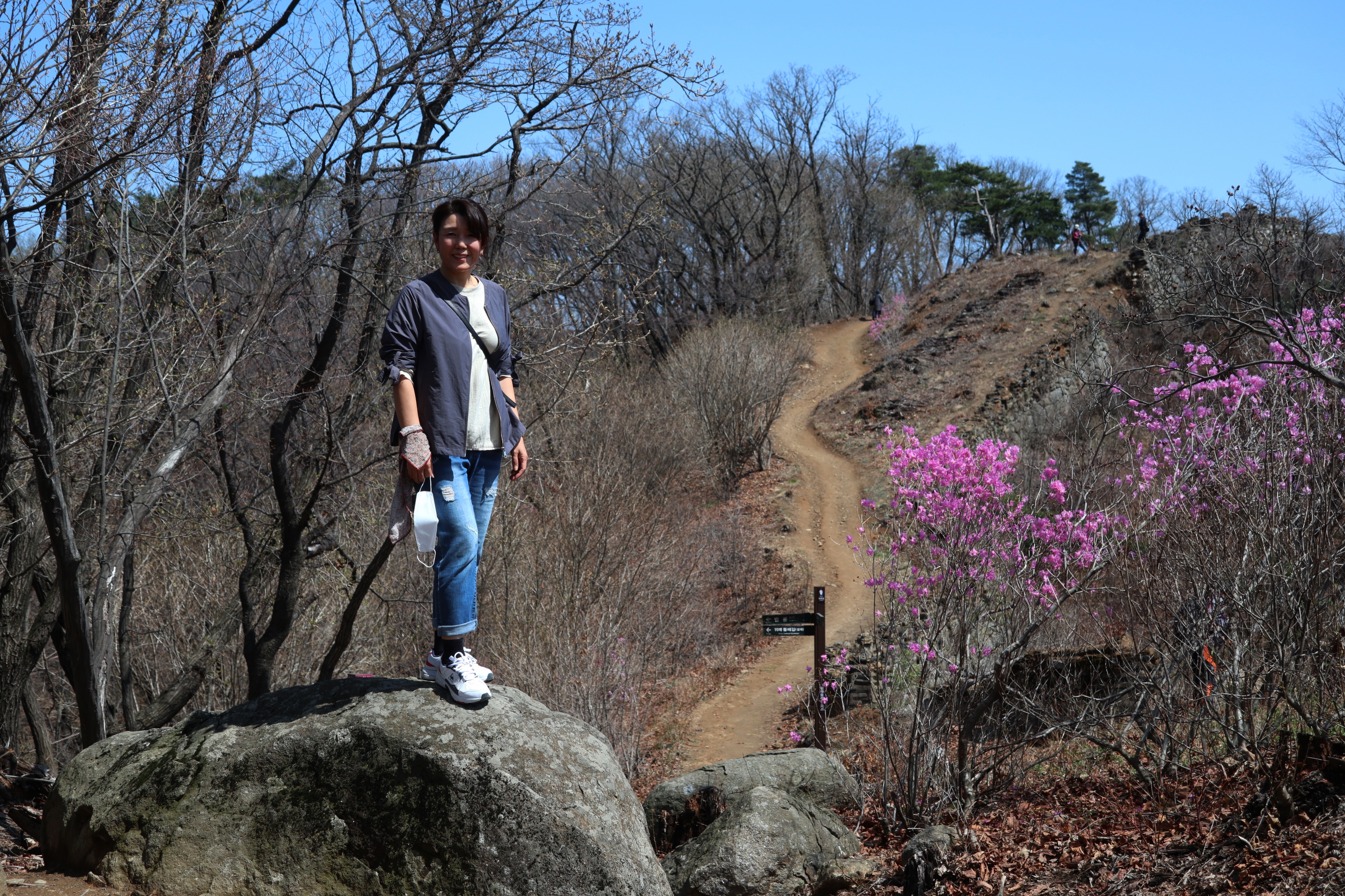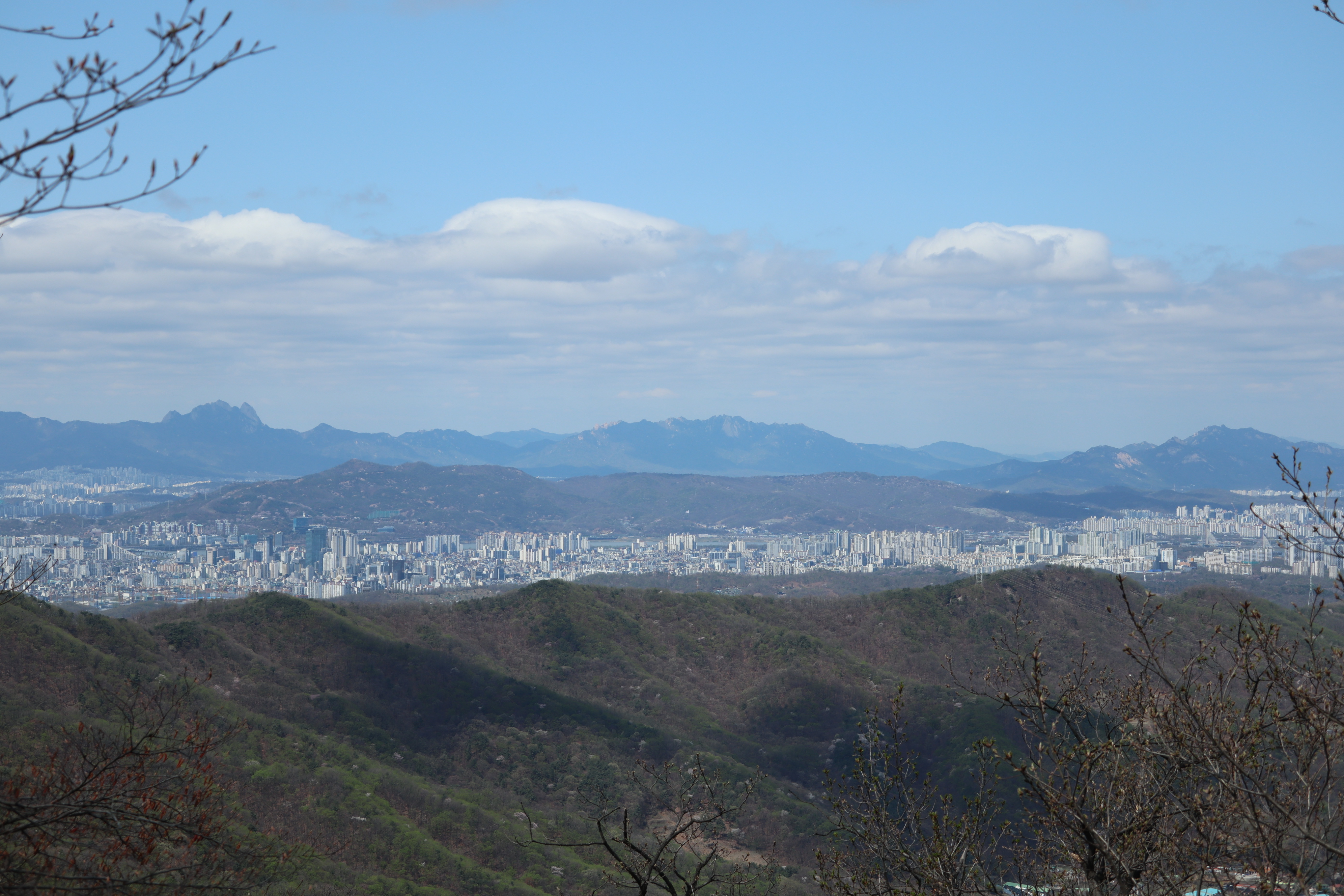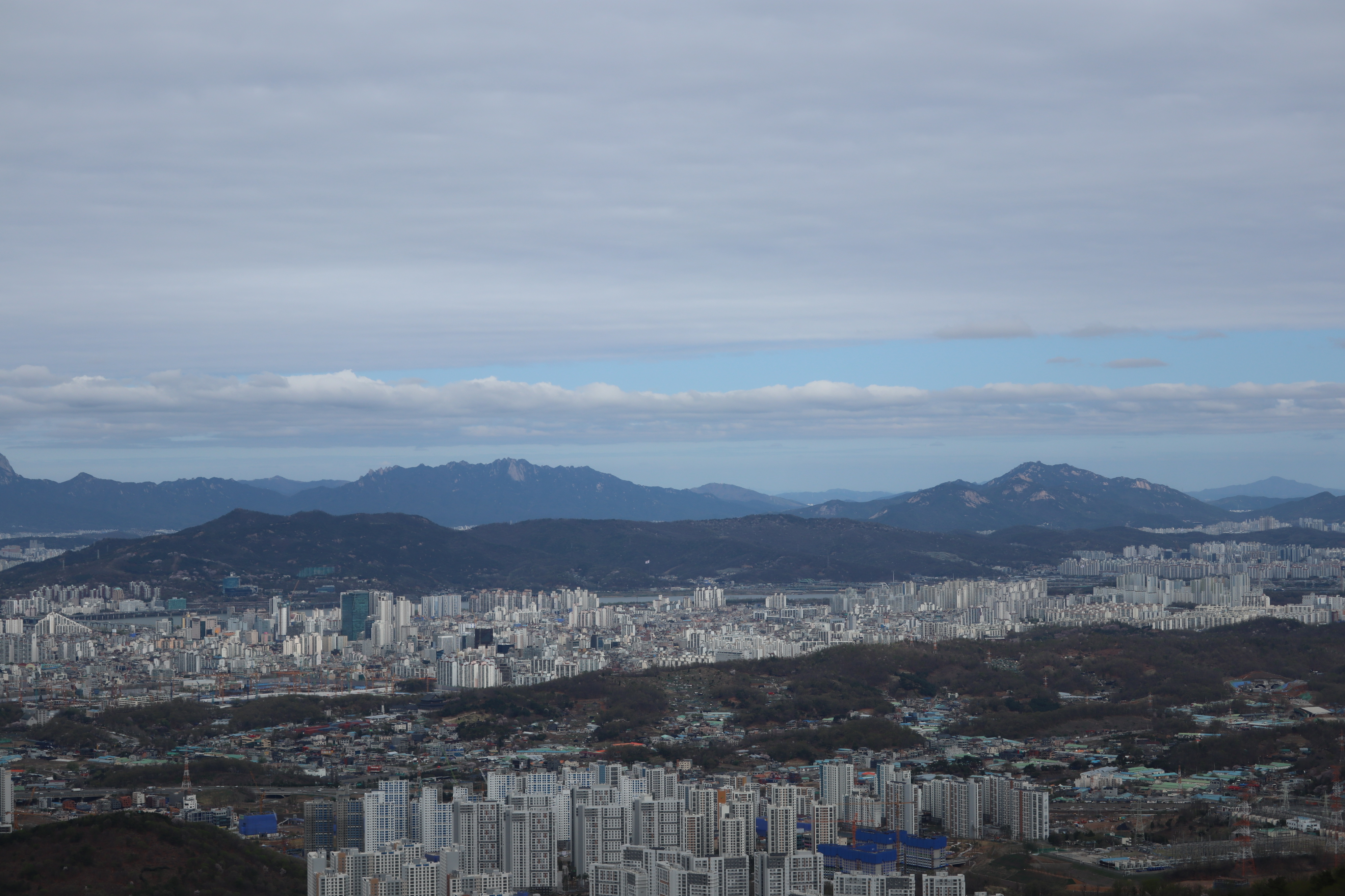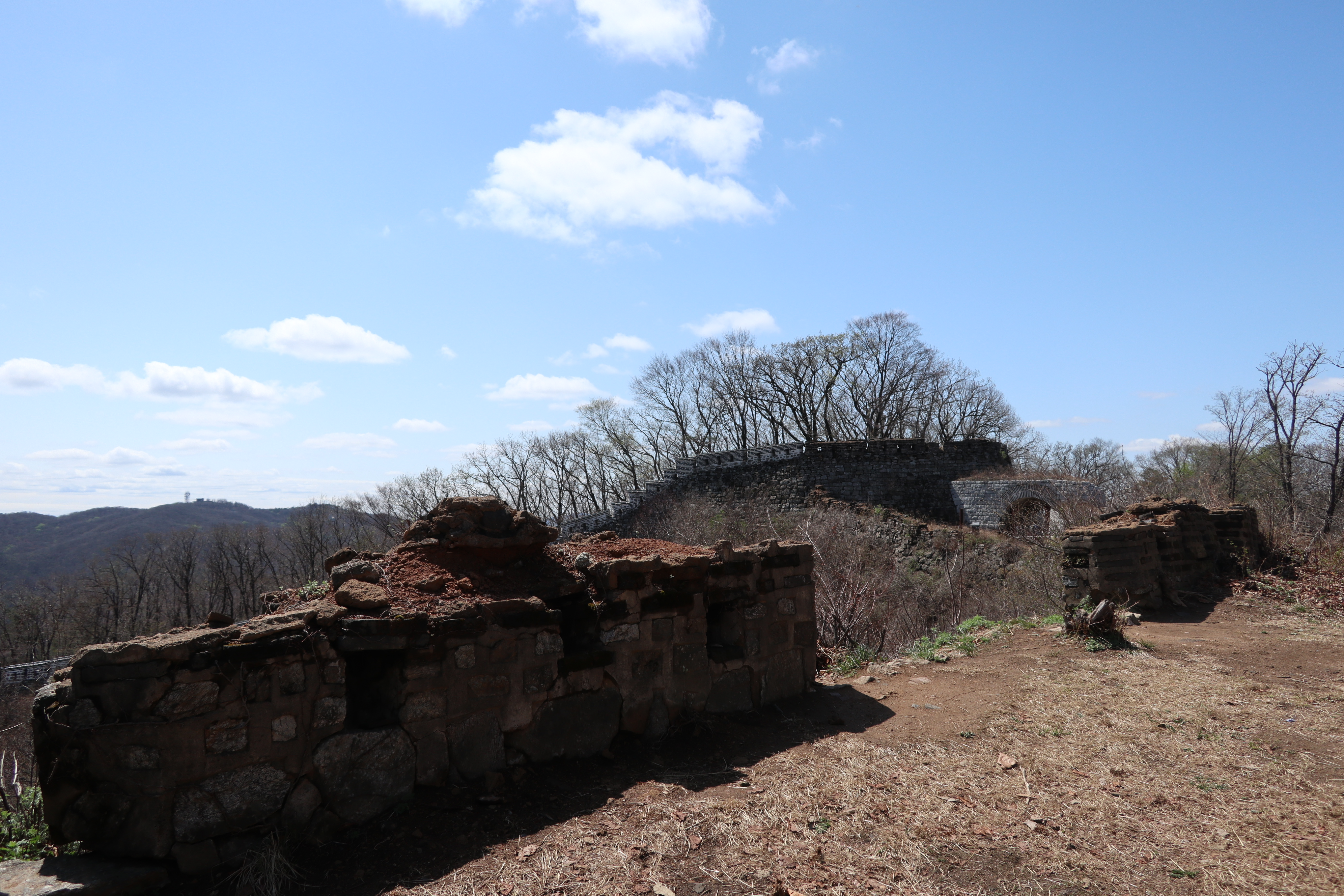 남한산성 회전 교차로10:19 세계유산 남한산성, 뒤편으로 남한산성 행궁남한산성 역사 테마길북문(전승문) 진입로는 공사중이다.10:24 북문(전승문)에서 좌측 남문(지화문)까지는 탐방로 정비공사중이다.공사중이기는 하지만 우리는 좌측 수어장대 방향으로 성곽길 따라 진행한다.북문(전승문) 성곽길을 올라 좌측방향 진행이다.북문을 통과한다.새벽까지 내린비로 길이 많이 젖어 있다.오름길에 북문 방향을 돌아 본다.우측으로 예봉산과 검단산이 조망되어 당겨 본다.동장대터에서 북문으로 이어져 오는 성곽길하늘에 구름이 잔뜩 끼어 있다.성곽길을 따라 걷는 호젓한 길이다.10:31 북장대터다시 탐방로를 만난다.북문(전승문)에서 0.3Km 진행지점우측 저 멀리로 경기 하남시 방향이 조망된다. 능선 너머 좌측은 서울시 동남권 시내이다.좀더 당겨 본다. 연주봉옹성에서 뻗어 내리는 능선길이다.경기 하남시 상사창동 방향이다. 수 많은 공장들이 들어서 있다.탐방로에서 다시 우측 성곽길 따라 오르면이내 다시 탐방로와 합류된다. 저 앞쪽에서 다시 우측 성곽길 따라 오른다.10:38 북장대터 인근산성이다보니 약간씩의 오르내림이 있다.연주봉옹성 도착, 지금은 공사중으로 폐문상태이다.이곳 제5암문을 나서게 되면연주봉옹성으로 나갈 수 있다. 지금은 제5암문이 폐쇄되어 나갈 수 없다. 성곽길 외곽을 따르는 등로는 정상적으로 운영중이다.드디어 서울시내가 조망되기 시작한다.더 당겨 본다. 연주봉옹성에서 조망되는 조망은 더 막힘이 없다.롯데타워와 그 뒤로 남산타워가 나란히 조망된다.연주봉옹성에서 뻗어나가는 능선길저 멀리로 북한산과 도봉산에 이어 수락산과 불암산, 그 앞쪽으로 망우산,용마산,아차산이 한눈에 펼쳐진다.북한산 전체 줄기를 담아 본다. 삼각봉이 웅장하기만 하다.천마산에서 예봉산으로 이어져 오는 수도권55산길인증샷도 남겨 보고롯데타워을 중간에 두고 좌측 남산과 우측 안산이다.청계산과 관악산 방향 조망좌측 광교산에서 청계산, 관악산으로 이어지는 능선이다.10:54 서문(우익문)진달래가 물기를 머금고 있다.비슷한 조망이 계속 이어진다.우리는 지화문(남문)방향 진행이다.수서역에서 대모산,구룡산,우면산을 거쳐 관악산으로 이어지는 능선이다.위례신도시(서울) 방향이제는 남산-안산-인왕산 능선길이 조망되고우측 저 멀리로 북한산 삼각봉에서 도봉산 자운봉을 거쳐 우측 수락산과 불암산으로 이어진다.북한산과 도봉산이 서로 마주보고 있다.11:04 수어장대 역시 공사중으로 출입금지 상태이다.수어장대 진입로다시 성곽길 우측방향도봉산이 웅장한 모습을 보여준다.수락산(뒤)과 불암산(앞)저 앞쪽은 남한산성 검단산이다.이제는 성남시와 분당구가 조망된다.좀 더 당겨본다.서울공항이다.위례신도시(서울)와 관악산 방향11:15 영춘정 통과영춘정이다.남문(지화문)으로 이어지는 성곽길저 아래에 남문이 조망된다.11:27 남문(지화문) 통과이제는 남장대(터) 방향 진행이다.지화문(남문)성남시 남한산성역에서 올라오는 등산로남장대(터)를 향해 또 한번 치고 오른다.오름길에 뒤돌아보는 남문남장대(터) 방향으로 진행제1남옹성이 보수공사가 한창이다. 저 멀리로 남한산성 검단산이다.이제부터 좌익문(동문) 이정표 따라 진행한다.11:39 남장대(터)를 지나고남장대(터) 이정표지나온 남장대터를 뒤돌아 본다.심심하니 포즈도 취하고동문까지 뚝 떨어지게 내려서야 한다.저 멀리 뾰족한 봉우리는???당겨보니 양평 용문산 백운봉이다.급내리막길이다.역방향으로 오르면 꽤나 힘들듯 하다.동문으로 내려선 후 다시 올라야 하는 성곽길저 멀리 장경사를 당겨 본다.다시 한번 급내리막길을 내려서면11:54 좌익문(동문)에 도착한다.횡단보도를 건넌 후이제부터 벌봉을 향해 나아간다.우익문(동문)동문(우익문)남장대터에서 동문으로 내려선 성곽길또 한번 힘들게 올라선다.우측방 뒤로 저 멀리 수어장대가 있는 청량산이다.이곳이 어디인고???12:01 송암정터송암정터에는 소나무와 바위가 어우러져 있다.여기 한번 돌아보세요.또 한번 오르네, 오늘 성곽길은 산행이라 생각하면 된다.전방에 보이는 동장대터까지 되비알 성곽길 따라 올라가야 한다.구불구불 이어지는 성곽길 오름벌봉갈림길인 남한산에서 한봉으로 이어지는 능선길12:09 동장대(터)를 향해 진행한다.뒤돌아 보니 꽤나 된비알길이다.12:15 장경사신지옹성다시 된비알길 오름이다.저곳을 오르면12:22 동장대(터) 도착이다. 옆지기는 이곳에서 처음으로 음료수를 꺼내 마신다.동장대(터)암문을 나선 후 전방의 벌봉을 다녀올 것이다.동장대터 표지석12:26 제3암문(봉암성암문) 이정표암문 밖으로 나간다.암문 밖으로 나가면 이정표가 있다. 위례둘레길이다.봉암성암문을 통과한다.이곳이 성곽길은 보수가 시급해 보인다.진달래와 함께은고개갈림길, 벌봉은 좌측으로 곧바로 갈 수 있으나, 남한산 정상석을 인증하기 위해서는 직진 봉우리를 올라서야 한다.은고개갈림길 이정표남한산 정상, 정상석만 이곳에 세워놨다.12:34 남한산(522M)12:40 벌봉벌봉에 별도의 정상표지는 없다.벌봉을 출발하는데, 애들한테 전화가 온다. 어디쯤